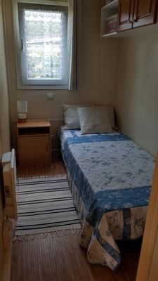 It has lounge/kitchen/diner opening on to the covered terrace with double doors, has a single and double bedroom, leather sofa bed for guests in lounge area (so sleeps 5 in total), shower room and separate cloakroom, garden with shed. The chalet is fully furnished and equipped and you can bring your pet with you.
