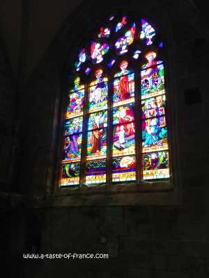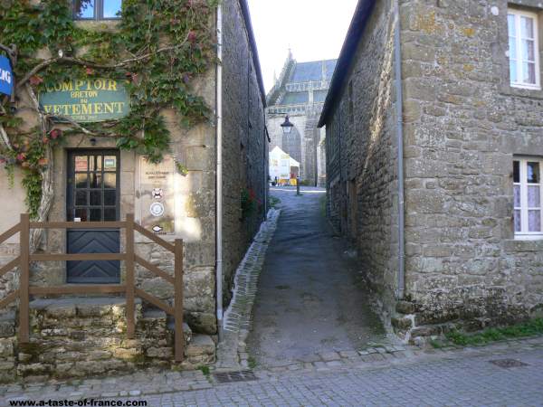 In the town centre is the 15th century St Ronan church. Which is a granite construction the interior has ribbed vaults, and contains a beautiful stained glass window. You can just see the church at the top of the passage way.