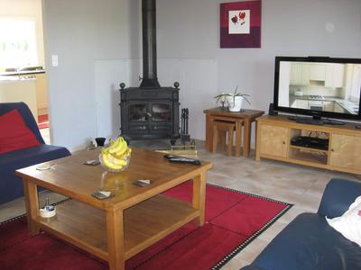 The living room has a wood burning stove and french doors leading to a small terrace area at the front of the property.