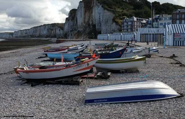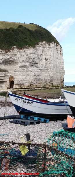 The beach is very similar to Etretat with white pebbles a high cliff and fishing boats on the beach. Plus some beach huts there is a car park on the sea front.